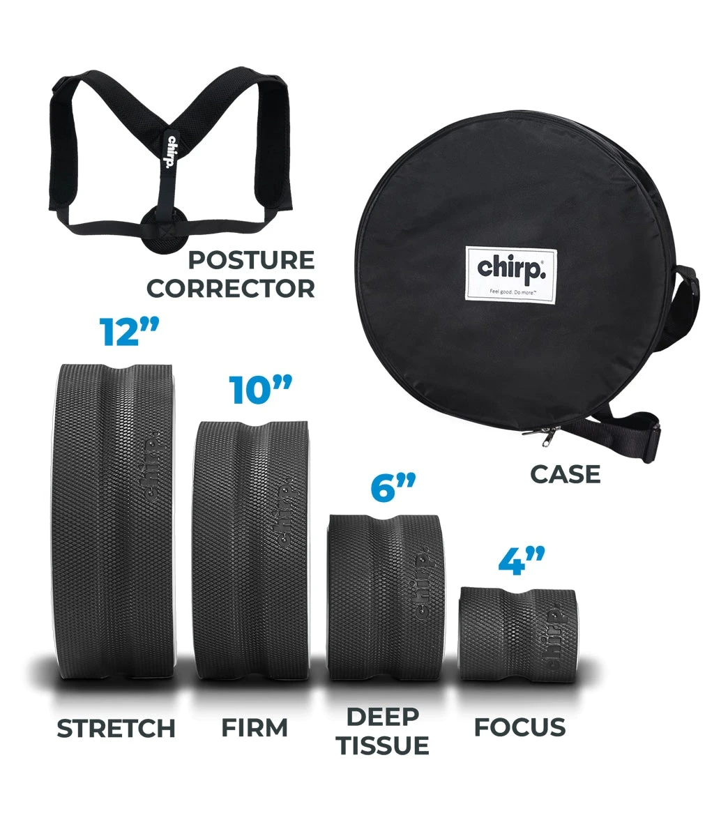 Back Pain? Neck Pain? No Problem. The Chirp™ Ultimate Back + Neck Pain Bundle comes with everything you need to help you Feel Good and Do More. This bundle features four Chirp Wheels that deliver different levels of massaging relief (Stretch, Firm, Deep Tissue, & Focus), a full-zip storage/travel case, and a Chirp™ Upper Back Posture Corrector to help improve your posture and reduce upper back pain. Package includes: 12″, 10″, 6″ and 4″ Chirp Wheel Plus Wheels, Zippered 12″ Chirp Wheel Case, Upper Back Posture Corrector.